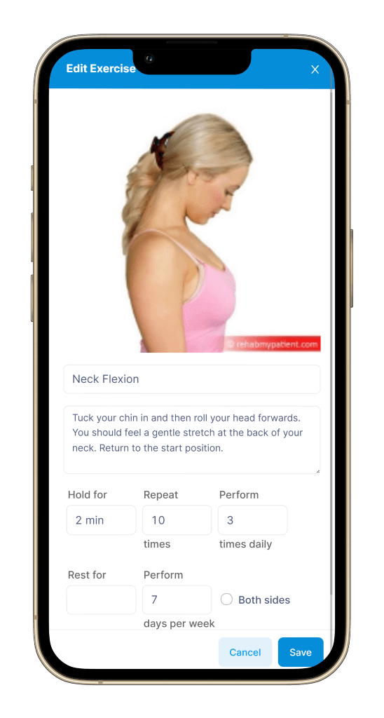 Tailoring exercise plans to your patients' needs is effortless with Rehab My Patient. Our software allows you to customize exercise title, description, sets, reps etc.